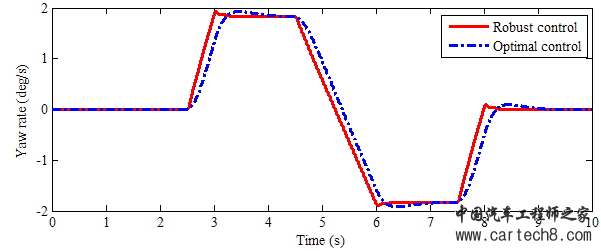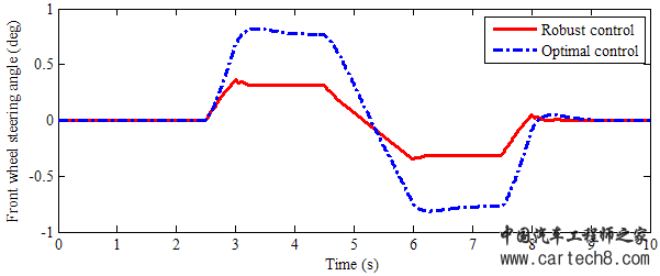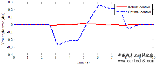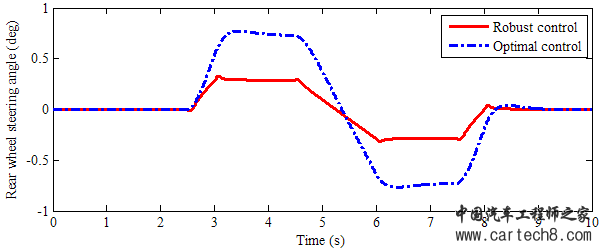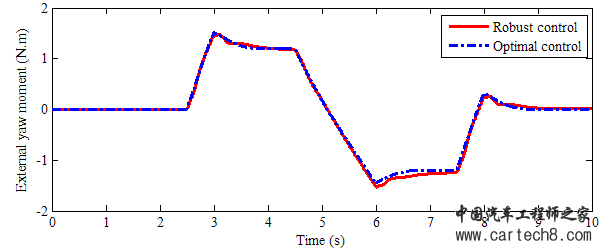 在此仿真情况下,4WIS EV在不考虑参数扰动的情况下,以20m/s的速度进行单移线变换机动,对比最优和鲁棒控制器。这里使用表1中的4WIS EV的名义参数。图8(A)、(B)和(C)描述了最优控制器和鲁棒控制器的输出,从中可以看出鲁棒控制器的前轮转向角和后轮转向角都小于最优控制器。然而,它们的附加横摆力矩曲线显示出相似的变化趋势和幅度。可以推断,控制器输出的大小将对以后的路径跟踪精度产生重要的影响。图8(D)和(E)显示车辆状态、侧向速度和横摆角速度。鲁棒控制器的侧向速度比最优控制器小得多,但横摆角速度相差不大。两个控制器的路径跟踪结果如图8(F)、(G)和(H)所示。结果表明,鲁棒控制器对横摆角和侧向位置的路径跟踪误差具有较小的超调响应和较低的稳态误差,这表明鲁棒控制器的路径跟踪性能优于最优控制器。