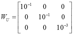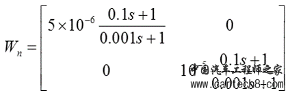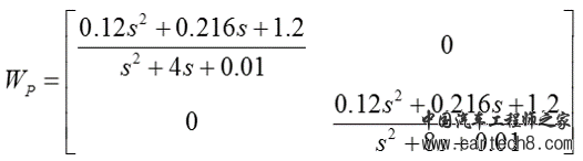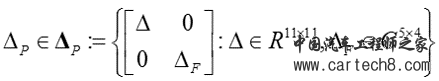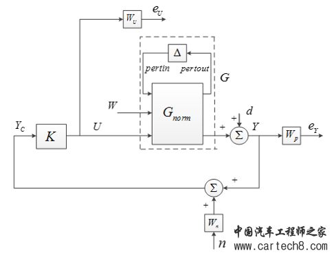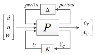 第一个不确定块Δ用来描述参数扰动,第二个不确定块是一个虚拟的不确定性块ΔP,它是利用μ综合方法来表示鲁棒性能要求的。块ΔP的输入是eU和eY,块ΔP的输出是d,n和W。
