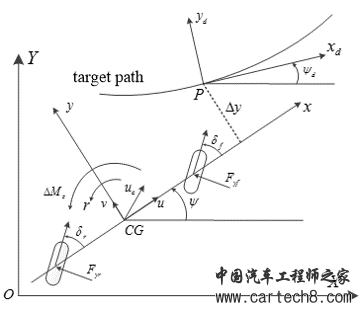 图3为4WIS EV的路径跟踪模型。xy为车身坐标系,xdyd坐标系表示其目标路径上的车辆方向。