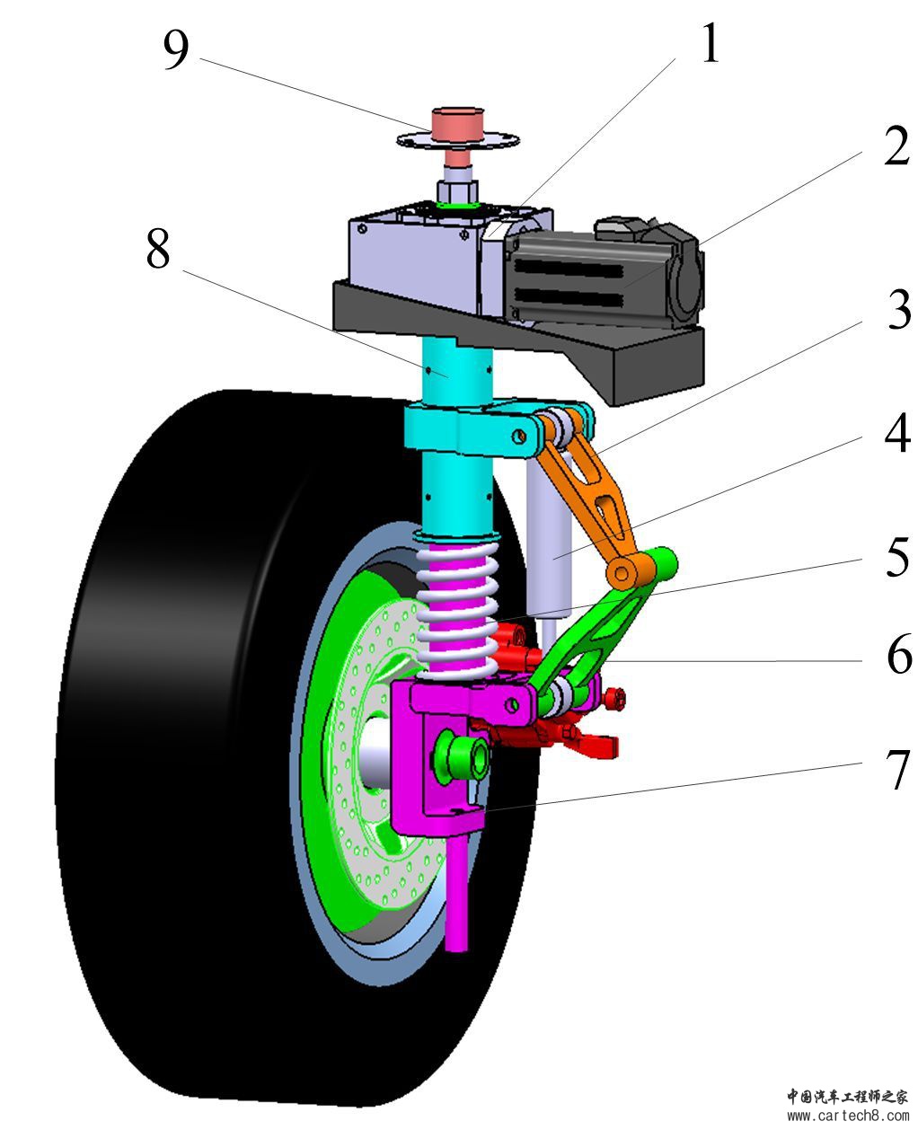 图2 SBW系统:1,蜗杆和齿轮减速器;2,转向马达;3,上摆动臂;4,减震器;5,弹簧;6,下摆动臂;7,下滑动柱;8,上滑动柱;9,车轮转向角传感器