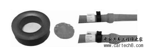 EMC是新能源车型面临的一大问题,电机、控 制器等高压部件发出不同频段的电磁波对整车音响 倒车影像及变速器传感器等产生干扰,目前国标没 有详细关于此方面的标准。有些主机厂采用在相关 高压零件(包括设备和线束)均增加磁环(图14), 整车EMC问题得到大大的改善。