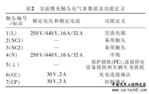 车辆插头和车 辆插座分别包含7对触头,其电气参数值及功能定 义见表2。
