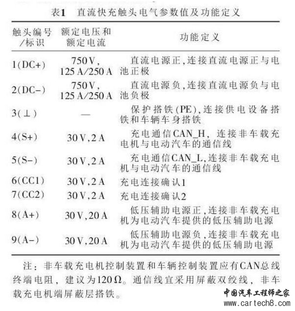 车辆插头和车辆插座分别包含9对触头,其电气参数值及功能定义见表1。