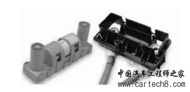 1) 带熔断丝开关(图6)—般安装在高压电 池包上,并要布置在方便插拔的位置。特点:带熔 断丝,结构复杂,成本相对高,体积相对大,适用 于大电流的高压系统上。