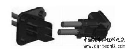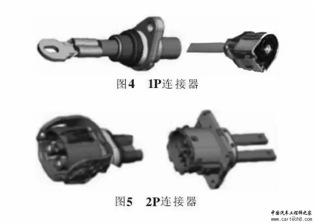 所有高压连接器都要求防水,根据使用位置不 同,防水等级也不一样。目前使用居多的有1P连接 器(图4)、2P连接器(图5)及3P连接器,超过3P 的连接器比较少见,通用性太小而且开发成本高, —般连接器厂家很少开发。