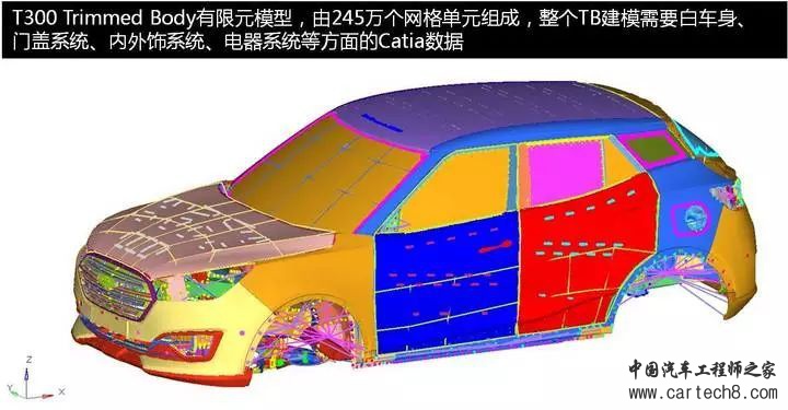 搭建模型是进行Trimmed Body仿真的第一步,工程师将T300数据导入软件中。由于车身主要由薄板件构成,因此采取用薄板中间平面代替薄板的方式进行网格模型建立,并对各个子系统进行合理的简化,并将各个子系统进行连接,得到T300 Trimmed Body 模型。模型共由245万个网格单元组成,整个TB建模需要白车身、门盖系统、内外饰系统、电器系统等方面的Catia数据。