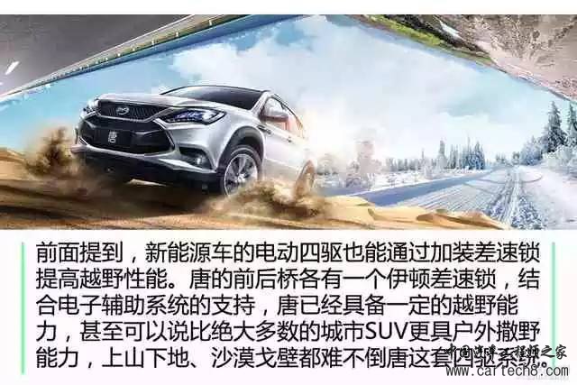当然,这一切得建立在电气零部件高度可靠和稳定的前提下,比亚迪唐上市不久,它在野外的稳定性表现是否能媲美配备传统四驱系统的SUV仍有待考证。下面我们看看比亚迪官方的宣传神片,窥视一下这套系统的功力。