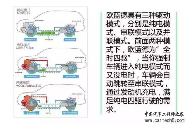 唐的驱动模式和欧蓝德大同小异,纯电模式下为全时四驱、混动模式下为适时四驱。由于唐缺少一台发电机,无法实现边充电边使用电动四驱,但可以实现发动机一边充电,后桥电机一边驱动车辆,此时为两驱形式。