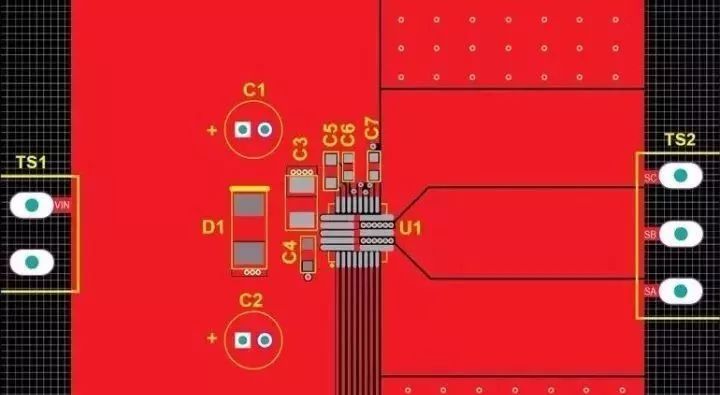 器件左侧的铜区域为功率输入口。这个较大的铜区域直接连接至器件的两个电源板。