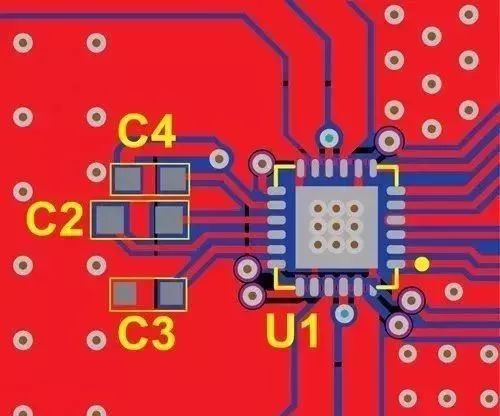QFN 器件封装边缘四周的板避免在顶部使用铜层吸收热量。必须使用热通孔将热量驱散至内层或 PCB 的底层。
