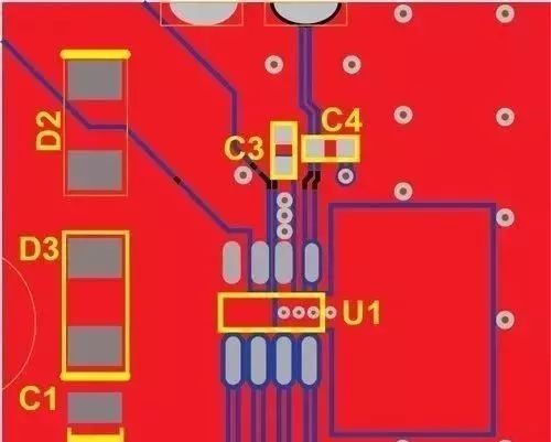 如下图所示为“倒装芯片引线框架”SOIC 封装的典型 PCB 布局。引脚 2 为器件电源引脚。请注意,铜区域置于顶层器件的附近,同时几个热通孔将该区域连接至 PCB 背面的铜层。引脚 4 为接地引脚,并连接至表层的接地覆铜区。引脚 3(器件输出)也被路由至较大的铜区域。