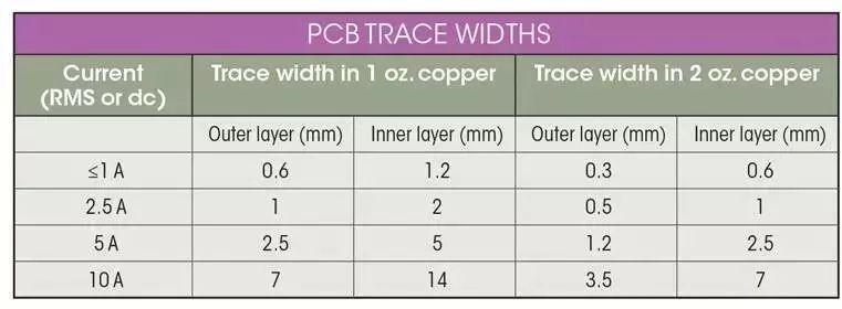 设计师通常使用 IPC-2221 标准来确定适当的走线宽度。这一规范针对各种电流电平和允许的温升提供了显示铜横截面积的相应图表,可转换为给定铜层厚度条件下的走线宽度。例如 1 盎司铜层中承载 10 A 电流的走线需要稍宽于 7 mm,以实现 10℃的温升。针对 1-A 电流,走线宽度只需为 0.3 mm。