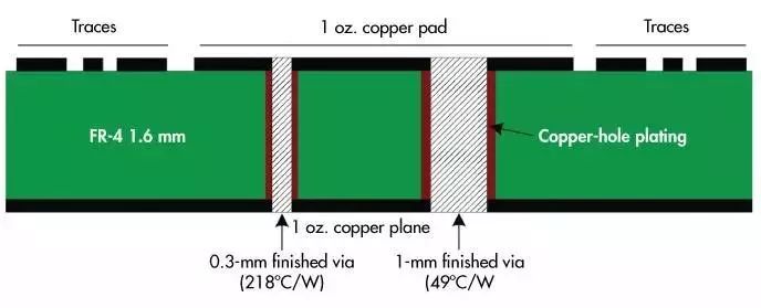 通孔具有热阻,这意味着当热量流过通孔时,通孔之间会出现一些温降,测量单位为℃/W。为使这一热阻降至最低,并提高通孔传输热量时的效率,应使用大通孔,且孔内应含有尽可能多的铜面积。