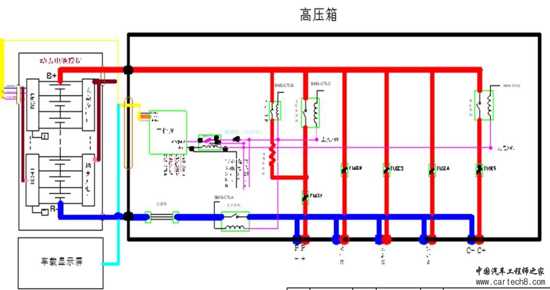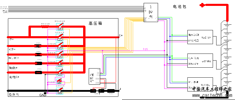 电动汽车电池包的电气部分主要有以下几大类:电池模组、电池管理系统(BMS) 、电气部件(继电器、接触器、保险、传感器、预充电阻等)、高低压线束和连接器。电气系统设计实现功能为基础,以安全为第一,可靠性为主,输出可靠高效的电能为整车提供动力。以下将从元器件、电气控制电路图、低压线束部分、总结及建议等几方面进行介绍。