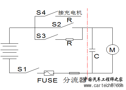 通常情况下电机前端会有一电容C,为了防止在继电器S1接通瞬间出在大电流,因此在高压柜内设置了预充电电阻进行限流。在继电器S1闭合之前,闭合预充电继电器S3,待电容C上的电压达到一定电池电压比例(通常为80%~100%)后,再闭合继电器S1,断开S3。