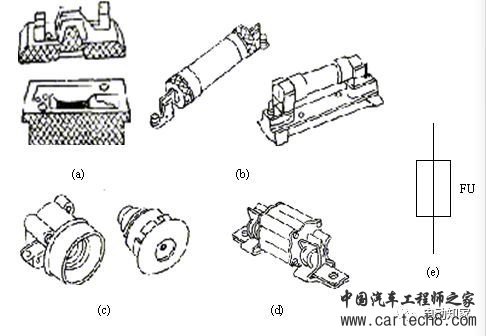 (a)瓷插式熔断器;(b) 无填料封闭管式熔断器;(c) 螺旋式熔断器;(d)有填料封闭管式熔断器;(e) 电气符号