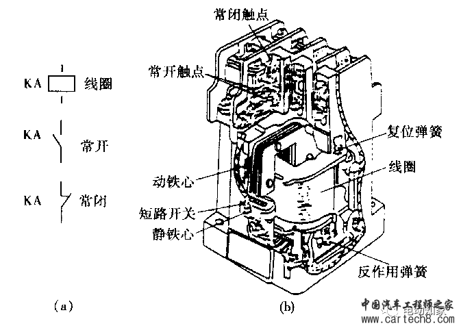 (a)图形、文字符号 (b)中间继电器的结构示意图