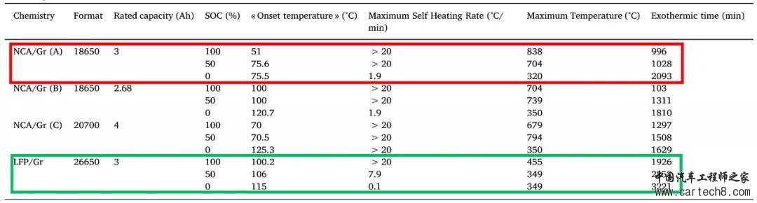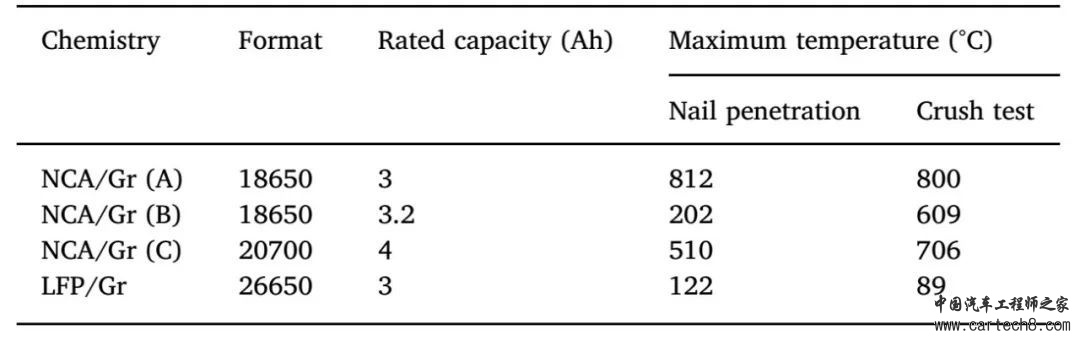 图11 LFP和NCA电池针刺实验结果对比[13],其中上方表格给出的是各不同电池的具体信息。