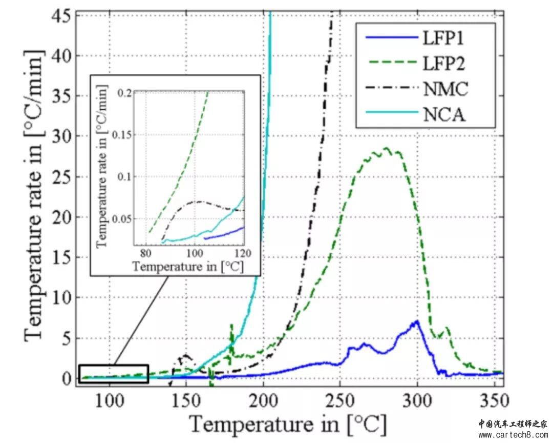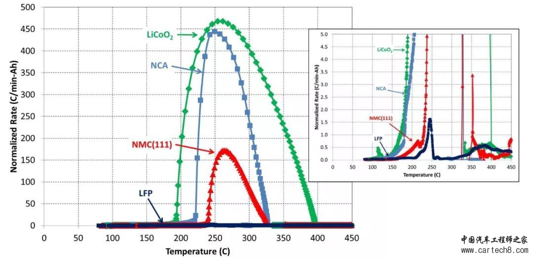 (2)无论是从起始放热温度、最大放热速率,还是最高温度、放热时间分析,LFP体系电池较NCA(NCM)体系电池有着明显的热稳定性优势。