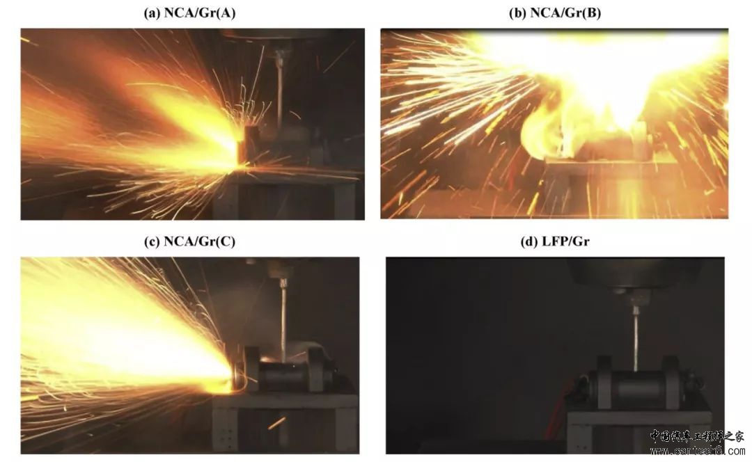最后来直观感受下LFP和NCA体系电池热稳定性差异。图11展示的是1款LFP电池和3款NCA电池针刺实验结果,其中3款NCA电池针刺均失效且火花四射场面壮观,而LFP电池则像个静静的女子。当然,正如前文所述,安全实验结果要结合电池设计信息和具体测试条件来分析,离开实验背景都应该谨慎去下结论。譬如以上结果并不意味着所有LFP电池均能“安静”通过针刺实验,而所有NCA电池针刺时都是火光四射。具体地分析具体的情况是马克思主义活的灵魂,小贱窃以为“具体问题具体分析”也是分析电池安全问题时应具备的品质。