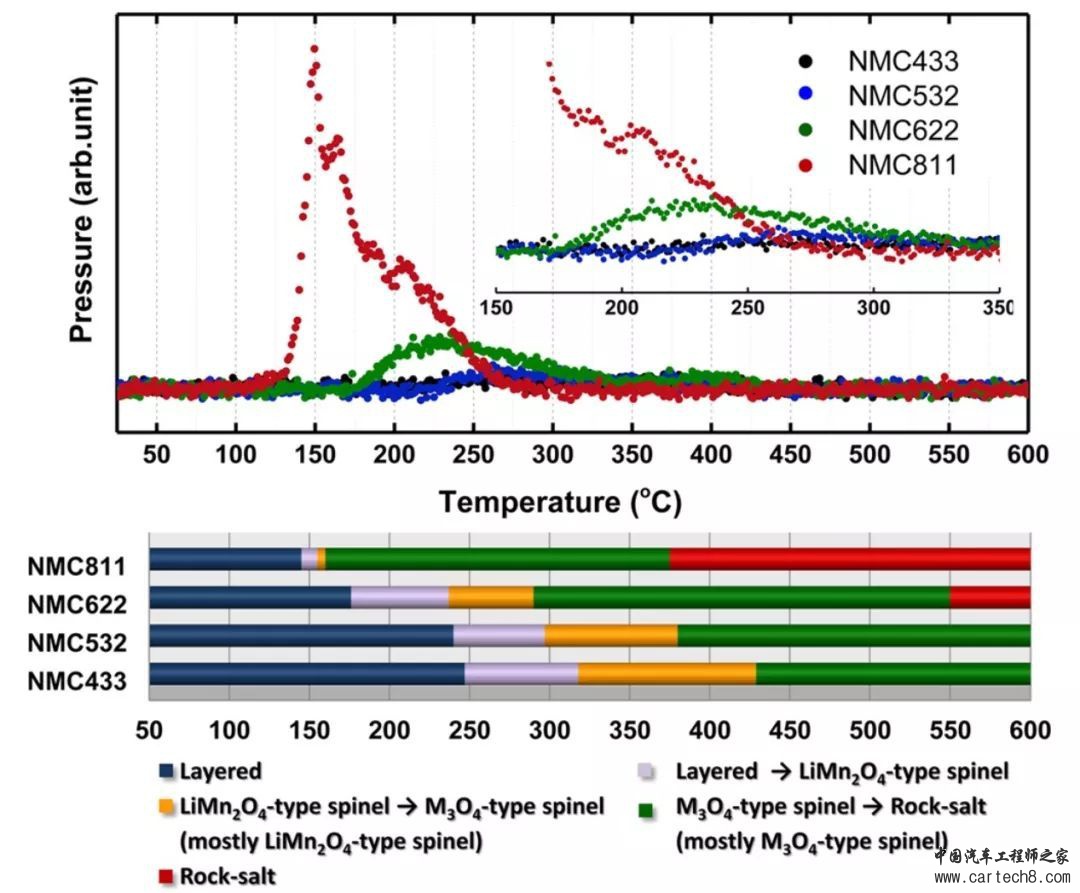 图6 NCM433、NCM 532、NCM622和NCM811 TR-XRD及释氧对比[8]