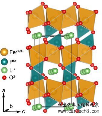 LFP分子中锂为正一价,中心金属铁为正二价,磷酸根为负三价,中心金属铁与周围的六个氧形成FeO6八面体,而磷酸根中的磷与四个氧原子形成以磷为中心共边的PO4四面体,借由铁的FeO6八面体和磷的PO4四面体所构成的空间骨架,共同交替形成Z字型的链状结构,锂离子则占据共边的空间骨架中所构成的八面体位置(图3)。该结构在结晶学的对称分类上属于斜方晶系中的Pmnb空间群,单位晶格常数为a=6.008 Å,b=10.334 Å,c=4.693 Å,单位晶格的体积为291.4 Å3。由于结构中的磷酸基对整个材料的框架具有稳定的作用,使得材料本身具有良好的热稳定性和循环性能。