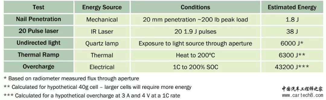 如图1所示,导致电池发生热失控的因素有很多。在电池滥用安全方面,GB/T 31485规定的测试项目包括过放、过充、加热、挤压、针刺等。目前该标准正在修订当中,征求意见稿已在工信部网站发布,预计不久就能看到正式的文本。但值得指出的是,电池安全标准仅是市场准入条件,即使通过了标准中规定的所有测试项也不意味着电池就一定安全。何况在实际安全认证中不少企业存在弄虚作假的情况,用特殊的样品通过测试认证。由于电池包含正极、负极、隔膜、电解液等多种组分,且各个企业电池化学体系设计、机械设计、工艺等不尽相同,不用测试失效机理不同,使得评估电池安全是一项极为复杂的工作。如图2所示,不同测试条件下电池的放热量存在显著差异,可能造成的危害也会不同。因此,在分析电池安全问题时务必小心谨慎,测试条件必须要表述清楚。