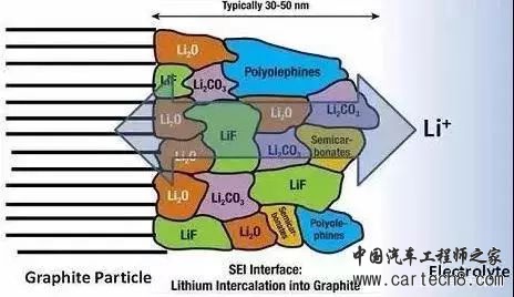在液态锂离子电池首次充放电过程中,电极材料与电解液在固液相界面上发生反应,形成一层覆盖于电极材料表面的钝化层。形成的钝化层膜能有效地阻止电解液分子的通过,但Li+ 却可以经过该钝化层自由地嵌入和脱出,具有固体电解质的特征,因此这层钝化膜被称为“固体电解质界面膜”( solid electrolyte interface) ,简称SEI。