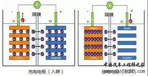 在电场的驱动下锂离子从正极晶格中脱出,经过电解质,嵌入到负极晶格中。