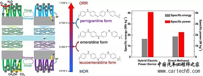 目前,大多数化学电源难以同时兼具高功率密度与高能量密度:燃料电池能量密度高,但由于液体燃料电氧化与氧电还原反应动力学过程慢,导致其功率密度较低;而超级电容器功率密度较高,但受限于电极活性材料比容量,其能量密度较低。本工作中,付旭东、夏章讯等创新性地设计并构筑了一种基于赝电容材料聚苯胺和电催化材料Pt/C(阴极)或PtRu/C(阳极)的新型双效电极,借此构建了原位直接甲醇燃料电池与超级电容器复合电源。该复合电源借助聚苯胺在阴极(氧电还原反应)与阳极(甲醇电氧化反应)电位区间可发生氧化/还原态转变的特性,实现了超级电容器原位自充电。得益于聚苯胺快速的赝电容放电特性,复合电源的脉冲放电性能大幅提升,单体电池功率密度可达4kW/kg,较传统直接甲醇燃料电池提高了80%以上。同时,甲醇的持续供给保障了复合电源的高能量密度。该工作阐释的赝电容与电化学反应耦合机制为下一代高比特性化学电源提供了新的研究思路。