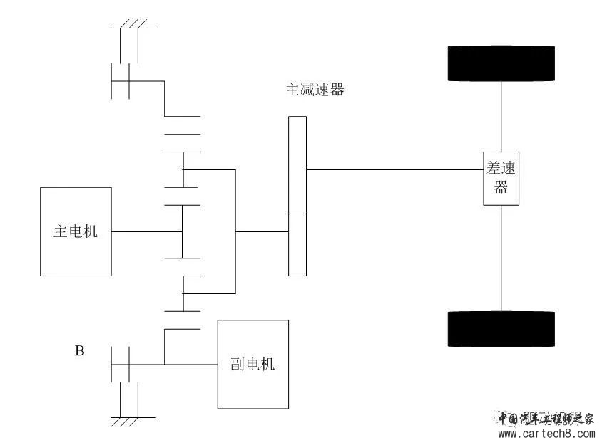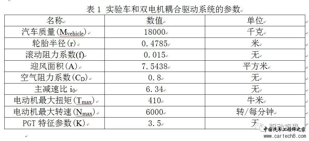 其中,主电机连接太阳轮,副电机连接齿圈,耦合后的动力通过传动系统由行星架传向车轮。图1中B代表可以通过锁定齿圈平滑实现模式切换的湿式离合器。实验车和双电机耦合驱动系统的参数见表1。
