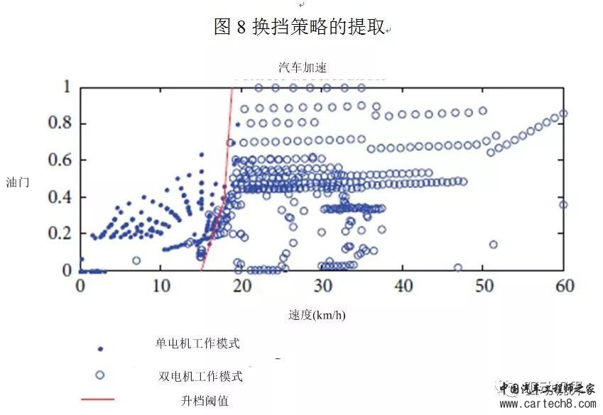 动态规划控制策略在实际驾驶条件下是不可实现的,因为它需要预见下一刻的速度和道路条件。尽管如此,分析其行为为改进基于规则的控制策略提供了有用的资料。基于上述讨论的仿真结果,我们将换挡控制策略提炼成3种,分别是升档,降档和能量分流的策略。