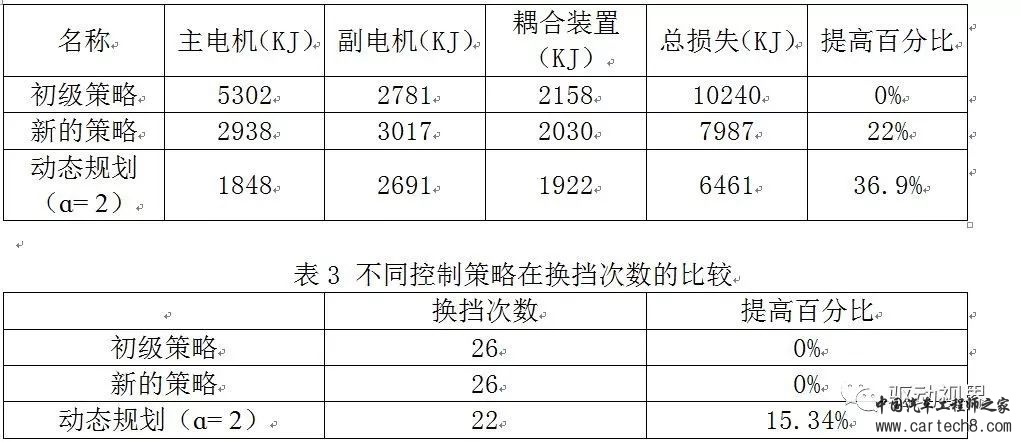 量损失。具体得说,初级控制策略的主要能量损失来源于主电机,而新的控制策略的主要能量损失来源于副电机。虽然新的控制策略减少了22%的能耗,但从动态规划操作中可以看出双电机耦合驱动系统还有减少36.9%能耗的潜力。从表3中,我们可以得知新的策略并不需要增加换挡次数,但也不能改善换档的性能。相反,动态规划(当ɑ= 2时)能减少15.34%的换挡次数。