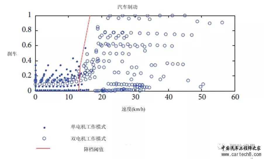 工作模式转变在减少能量损失和增加乘坐舒适性中是至关重要的。在原来的动态规划中,双电机耦合驱动系统需要频繁换档来减少能量损失,这可能会影响乘坐舒适性,并且当ɑ= 2时,能量损失并没有增加很多,但换档次数只是原始动态规划结果的38%。当ɑ= 2时,基于动态规划的升档和降档的数据如图8和图9所示。图8中的第一个图显示的是车辆正在加速的工况,而第二个图显示的是车辆制动时的工况。分离工作模式的转换策略就可以通过手动连线得到了。与其他方法相比,这项工作的好处是不仅确定了合理的换挡点,也帮助我们决定什么时候升档和降档,可避免在实际驾驶中频繁换挡。其结果如图9所示。