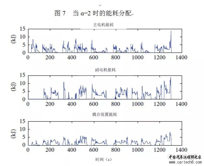 当仅优化燃油经济性时,加权α设定为0,且使用了中国典型城市的道路循环工况。在动态规划策略下的汽车仿真结果如图3,4,和5所示。从图3和图4中,我们可以得知当车辆速度较低时,主电机将提供所需的速度和动力,而当车辆速度较高时,主电机转速将降到一个非常低的点,车辆所需的大部分速度和动力将由副电机来提供。这是因为电动机在高转速低扭矩的工况下效率很低。从图2中我们可以得知电动机效率在低转速低扭矩的工况下也很低,但是在这种工况下,输出功率也低,因此能量损失比在高速下少。与主电机相比,副电机倾向于在高转速和高扭矩的条件下工作在高效率区。从图5中我们可以得知双电机耦合驱动系统的能量损失可分为三类:主电机损失,副电机损失,耦合装置损失。其中副电机损失占主要部分,而主电机损失和耦合装置损失基本相等。这是因为副电机总是在高功率状态工作,尽管它的工作效率相对主电机较高。