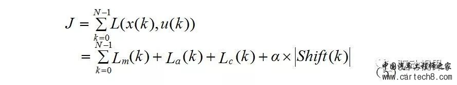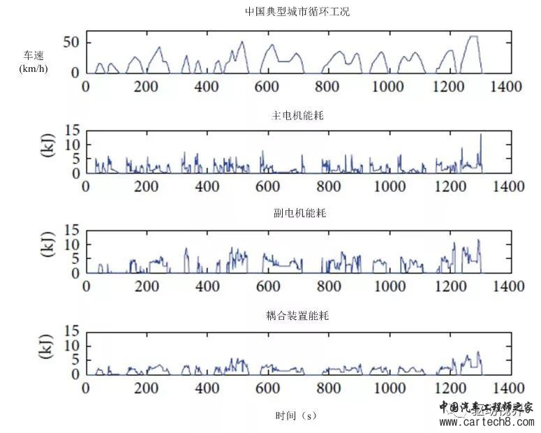这里的N是驾驶循环的时间,L是瞬间的损失包括主电机的能量损失Lm(k)、辅助电机的能量损失La(k)、功率耦合齿轮箱的能量损耗Lc(k)和模式改变的损失 。