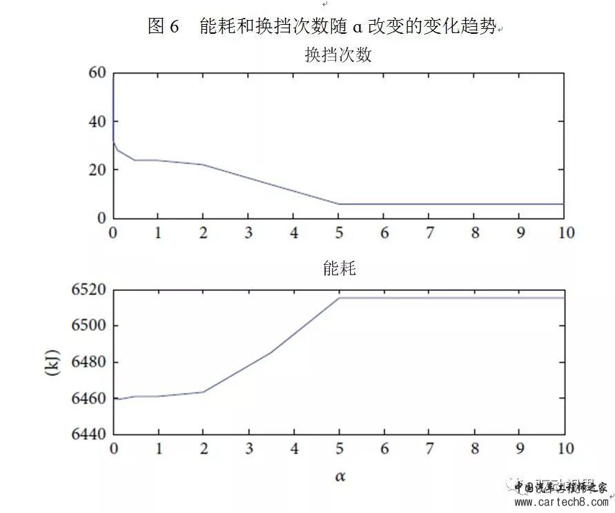 考虑到能量损失和切换频率之间的权重因子是多变的,其取值为ɑ=[0,0.01,0.1,1,2,3.5,5,10]。ɑ的合理取值要满足公式(5),这种折中研究是在早期设计过程中非常重要的,因为它提供了有关能量损失和不断变化的频率之间的灵敏度的有用信息。其能量损失和换挡次数随ɑ改变的变化趋势如图6所示。从图6中我们可以得到,当ɑ<1且在增加时,换挡次数快速下降(从58降到24)而能量损失仅增加了少许,可忽略不计。当1<ɑ<2时,能量损耗和换挡次数都变化很小。当2<ɑ<5时,换挡次数再次快速下降,而能量损耗也快速增加。当ɑ超过5时,换挡次数和能量损耗都保持不变。因此,ɑ合理的取值是1到2之间.在进一步讨论中,我们设定ɑ=2。