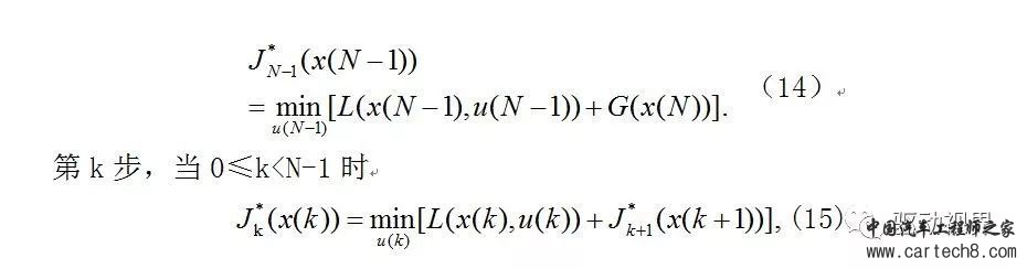 其中 是从k时段开始的参数x(k)的最优成本函数或是最优值函数。它表示系统从参数x(k),时段k开始,而后遵从最优控制原则一直计算到最后一步的最优值。上述递归方程是在求解寻找最优控制策略的方法。而最小化问题被公式6的不等式和驱动周期的等式所约束。
