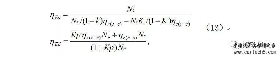 其中 是汽车加速时行星齿轮的效率, 是汽车减速时行星齿轮的效率, 表示当齿圈固定,能量从太阳轮输入,行星架输出的效率, 表示当太阳轮固定,能量从齿圈输入,行星架输出的效率, 表示当太阳轮固定,能量从行星架输入,齿圈输出的效率, 表示当齿圈固定,能量从行星架输入,太阳轮输出的效率。