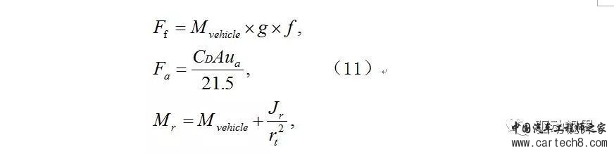 其中Mvehicle是汽车的质量,g是重力加速度,f是滚动阻力系数,CD是空气阻力系数,A是汽车有效迎风面积,ua是汽车的速度。