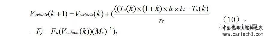 其中,Tb(k)是摩擦制动力,i0是主减速器的减速比,K是行星齿轮系统的特性参数,Ff和Fa分别是滚动阻力和空气阻力,rt是轮胎半径,Mr是汽车的有效质量,Jr是汽车所有旋转部件的等效转动惯量。Ff,Fa和Mr可由下列公式得出: