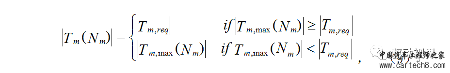 这里的 是电机输出转矩的绝对值,Nm是电机的转速。当车辆在紧急情况下制动时,DMCPS不能提供足够的制动力。这里的制动策略被确定为系列策略:当DMCPS可以提供足够的制动力,所有的制动力由DMCPS提供;当所需的制动力超过DMCPS的能力,DMCPS将提供最大的力矩,同时额外的力将由摩擦制动系统提供。输出转矩 可以表示如下:
