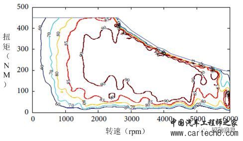 从表1,我们可以得到:虽然DMCPS需要两个电机,但是它们有相同的规格并且它们是相同的类型。所以在这里,我们只显示了一个电机的效率图。