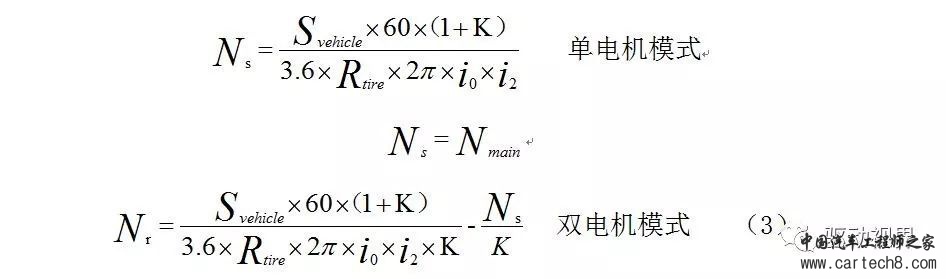 该模式匹配的是转速耦合驱动系统,其功率分配比与速度比成正比。同样,在该模式下有两种情况:在单电机工作时,其驱动系统不需要动力分配控制,主电机将根据车速和油门/刹车的运动提供所有需要的功率。在双电机工作时,考虑到电动机的效率特性,主电机将工作在速度相对高的固定点Nmain,而辅助电机的转速将根据车辆速度的需求而改变。而且电机的输出转矩会同时根据油门/刹车的运动而改变。