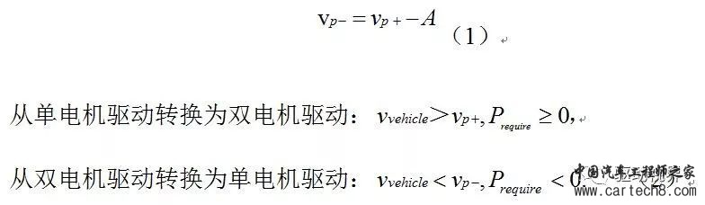 该模式基于驱动系统的工作性能和电动机的效率图,如果车辆速度超过vp+或低于vp-,采用模式切换控制策略,以确定辅助电机是否工作,如公式(2)所示。vp+和vp-的关系如下所示:
