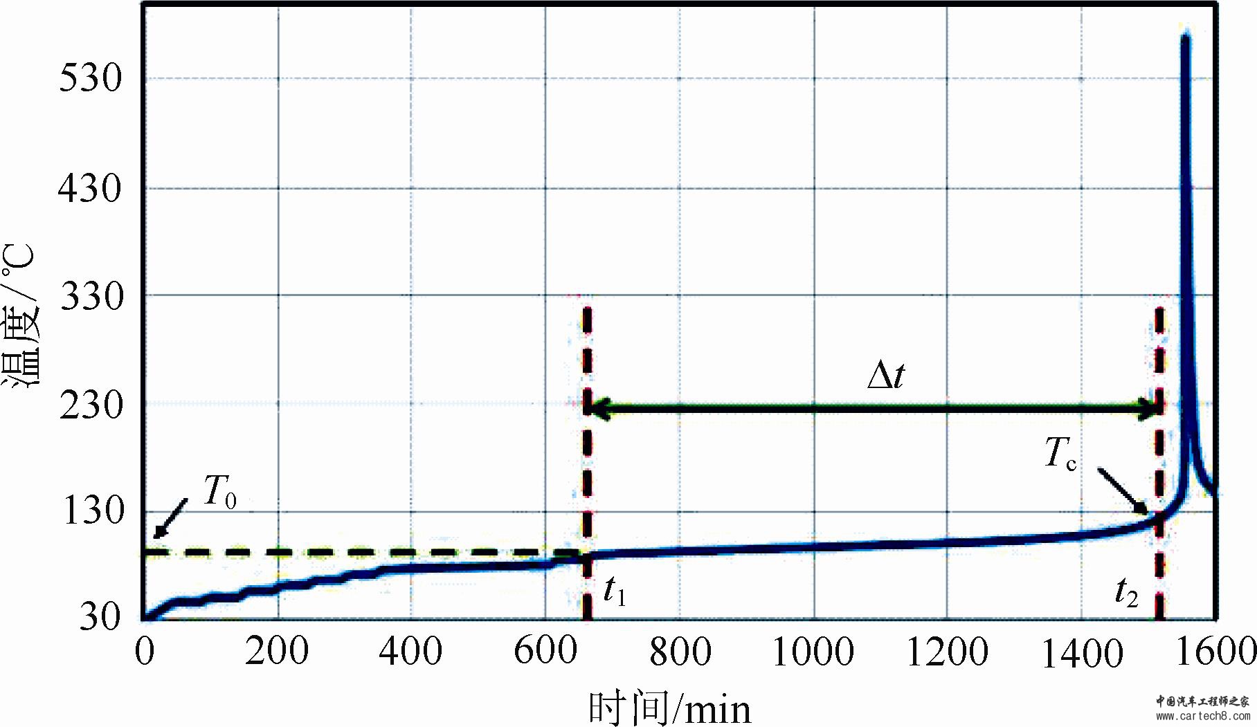 图9显示了典型的电池热特性T-t曲线。曲线测试条件是:首先对电池加热,升温步阶为5 ℃,然后停止加热,等待使电池和量热强温度一致,然后进行搜寻,如果搜寻到电池的升温速率大于0.02 ℃/min,那么系统判定电池发生自放热,进入绝热模式。如果在一定时间内,没有检测到电池的升温速率大于0.02 ℃/min,则继续升温步阶5 ℃,然后检测升温速率,依次反复。如果电池升温速率持续大于0.02 ℃/min,则设备持续跟踪电池温度。电池升温速率持续大于0.02 ℃/min,并开始持续升温,这时电池被认定为开始自加热,开始自加热的温度称为“起始温度”,如图9中的T0,其对应的时间标记为t1。T0揭示了电池内部的热稳定性,T0越高说明电池的热稳定性越好。电池开始自加热后,温度逐步升高,会进一步引发电池内部的化学反应,并产生更多的热量,继而持续推高电池的温度。当电池的温升速率达到1 ℃/min时,可以认为是热失控的开始,此时的温度称为Tc,时间标记为t2。定性地说,Tc越高说明电池的安全性越好。Δt=t2-t1的时间越长也说明电池的安全性越好。
