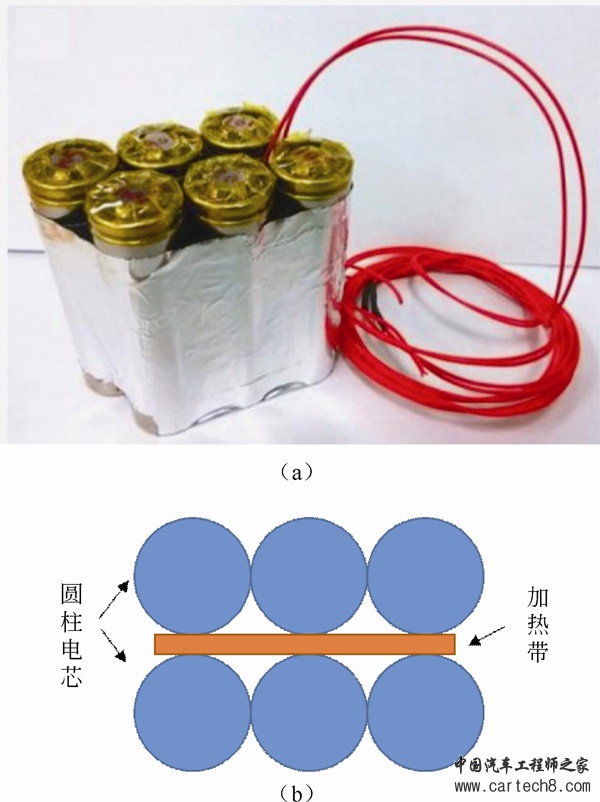 图6是圆柱形电池(如18650电池)的常用打包方式。选取合适尺寸的加热片,将加热片粘贴到“电池包”之间,测试过程中监控电池外表面温度变化。
