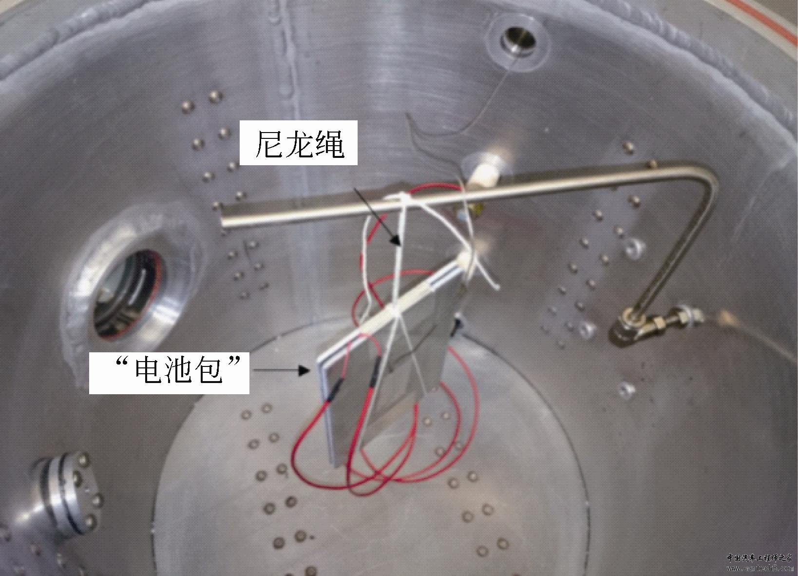 包方式。选取和电池最大面尺寸接近的加热片[图4(a)],将加热片用导热性能良好的铝箔胶带粘贴到两块电池的中间组成“三明治”结构的“电池包”[图4(b)],然后将“电池包”悬置到量热腔中(可采用悬挂或支架的方式,图5),在电池外表面黏贴热电偶,以监测实验过程中电池温度变化。
