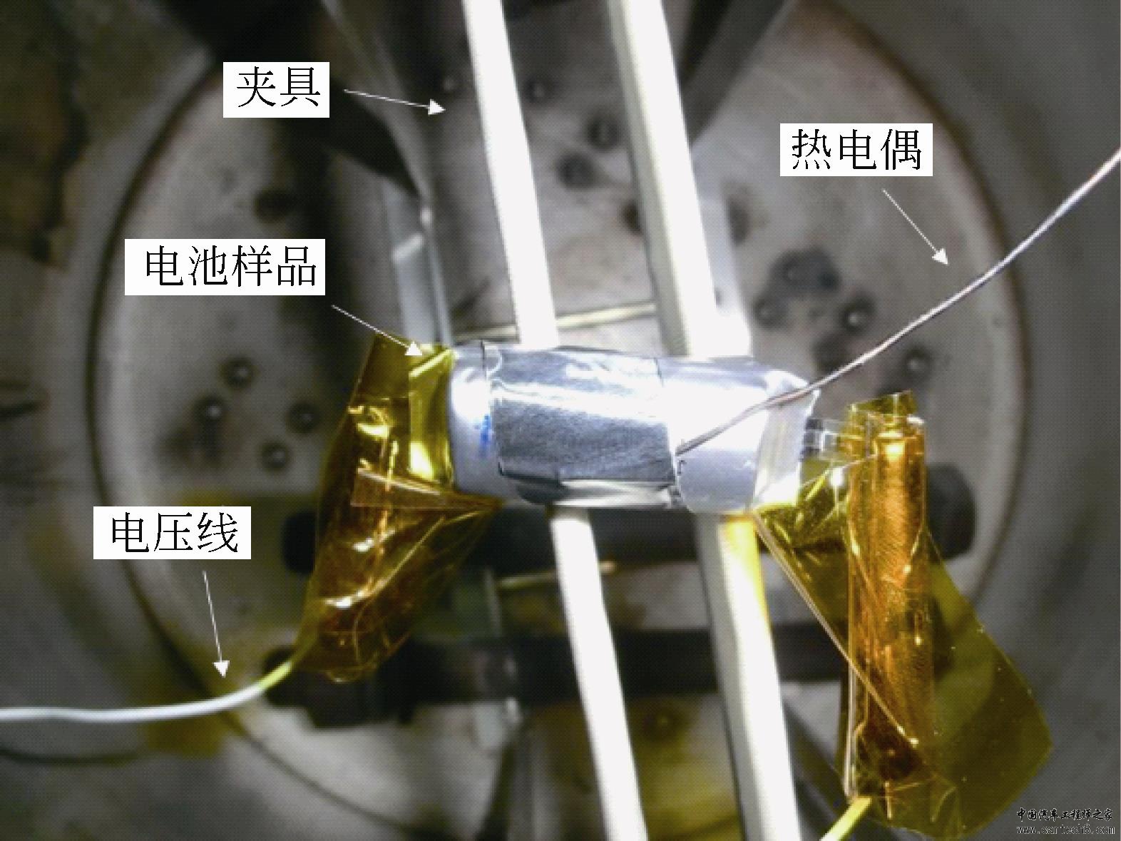 使用ARC可以实现对电池的热稳定性能测试。其工作原理同2.1材料热失控测试,但操作更为简单:通过夹具将电池固定在量热腔内部,测温热电偶固定于电池表面,可如图3所示。可以通过电压采集设备同步监测电池开路电压变化。