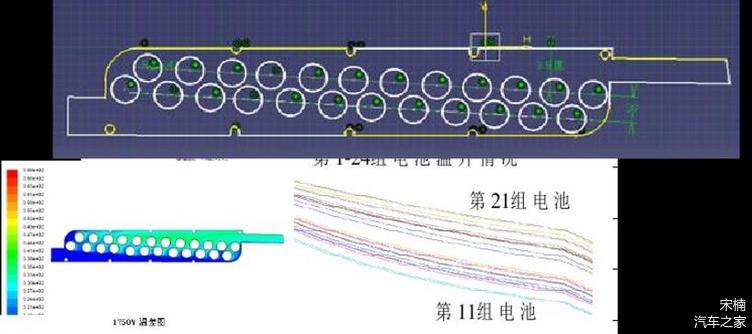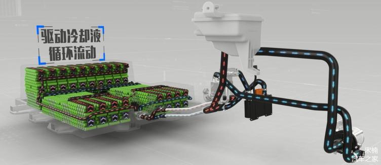 如上图所示,江淮iEV系动力电池液冷技术,是用一套管路将冷却和加热部件串联起来(动力舱内)和动力电池内部1套管路。